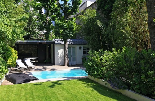 The house has a large garden of 300m2 itself surrounded by other gardens. Peace assured while being 2 minutes walk from the charming Place de la Contrescarpe and Rue Mouffetard. The pool is heated all year round at 30 degrees, without any vis-à-vis (it has a counter current swimming system).